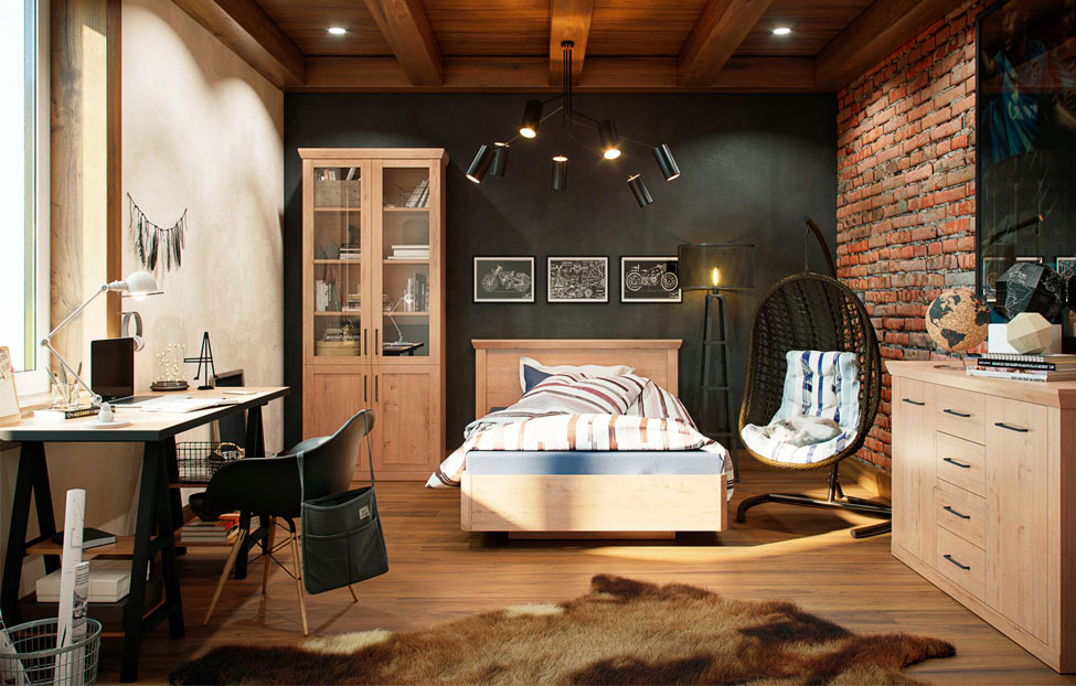 - Молодежная будет гармонировать как с классическими оттенками белого, серого, коричневого, так и с текстурами — деревом, бетоном и кирпичом;