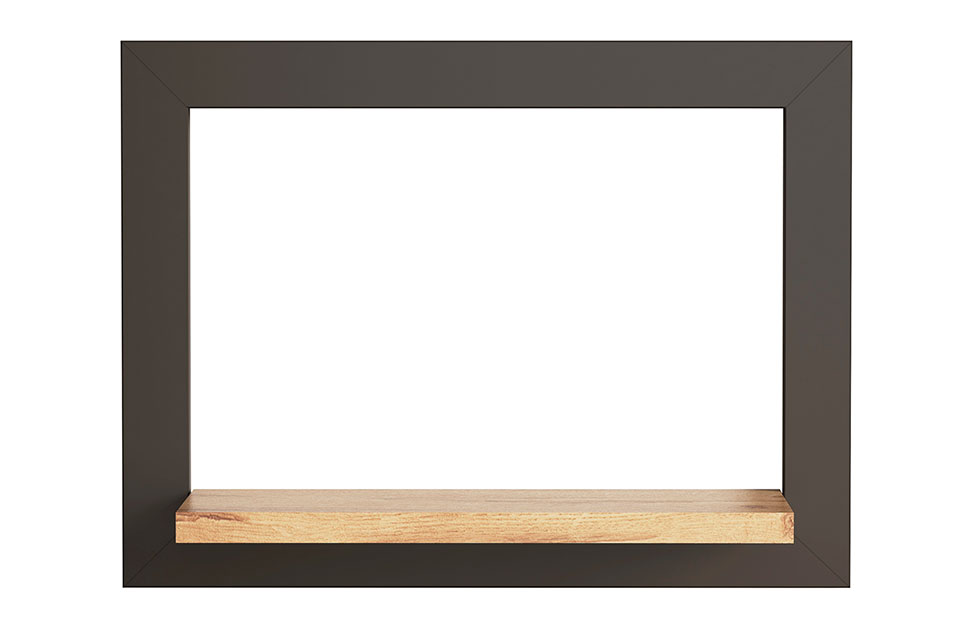 Конструкция легко выдержит крупное фото в рамке, несколько книг, относительно массивные предметы декора, горшок с комнатным растением весом до 2 кг. Основная часть полки изготовлена из прочной ламинированной ДСП, торцы которой защищены кромочной лентой. Рамочное обрамление сделано из МДФ-профиля. В каталоге представлено три размерных и два цветовых решений (дуб бунратти + белый премиум/черный графит).