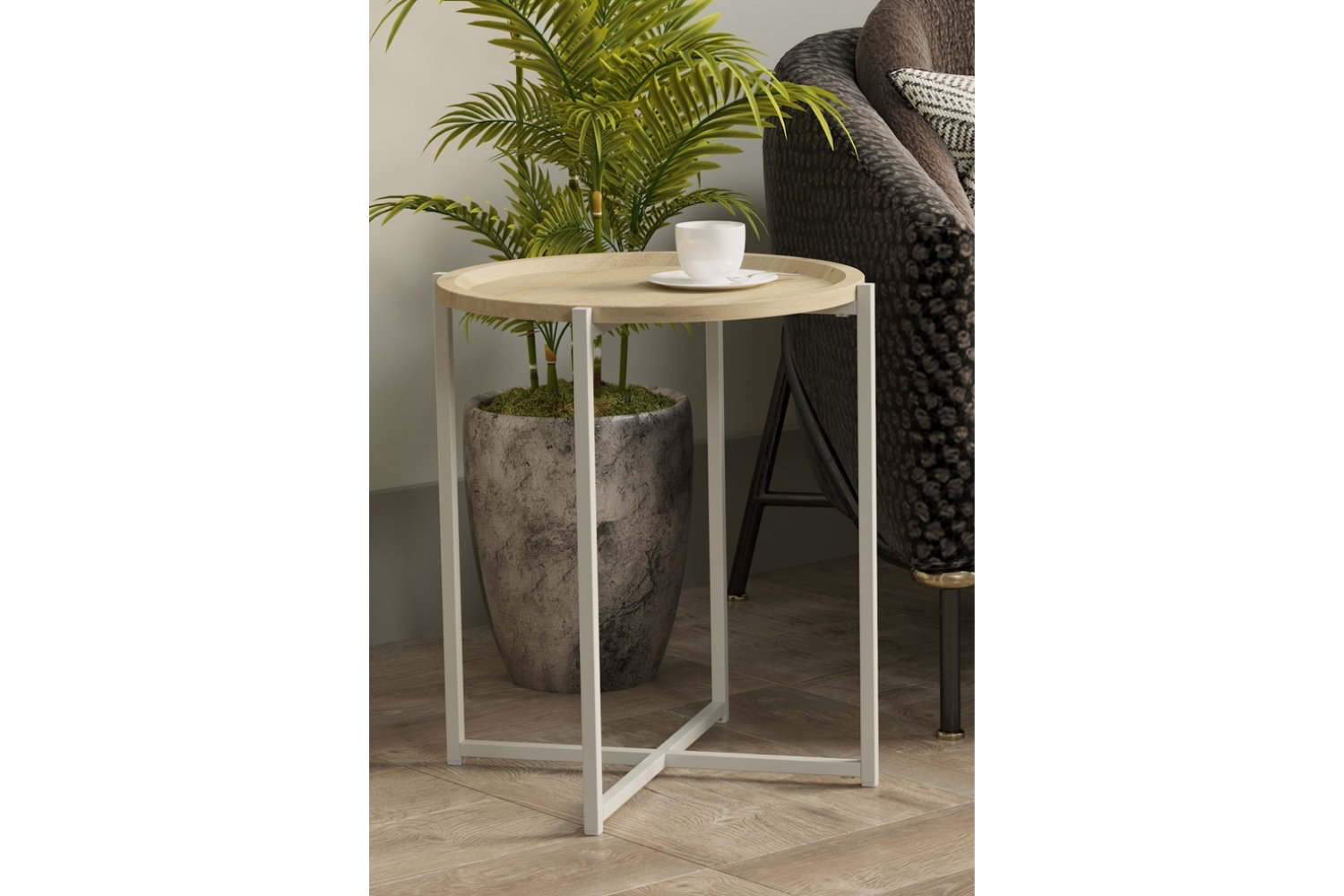 Журнальный столик «Бьерни» в стиле лофт станет удачным аксессуаром для современного интерьера. Круглая, слегка вогнутая столешница с оригинальным бортиком изготовлена в нескольких цветовых решениях, лаконичный контраст которым придает однотонный каркас.