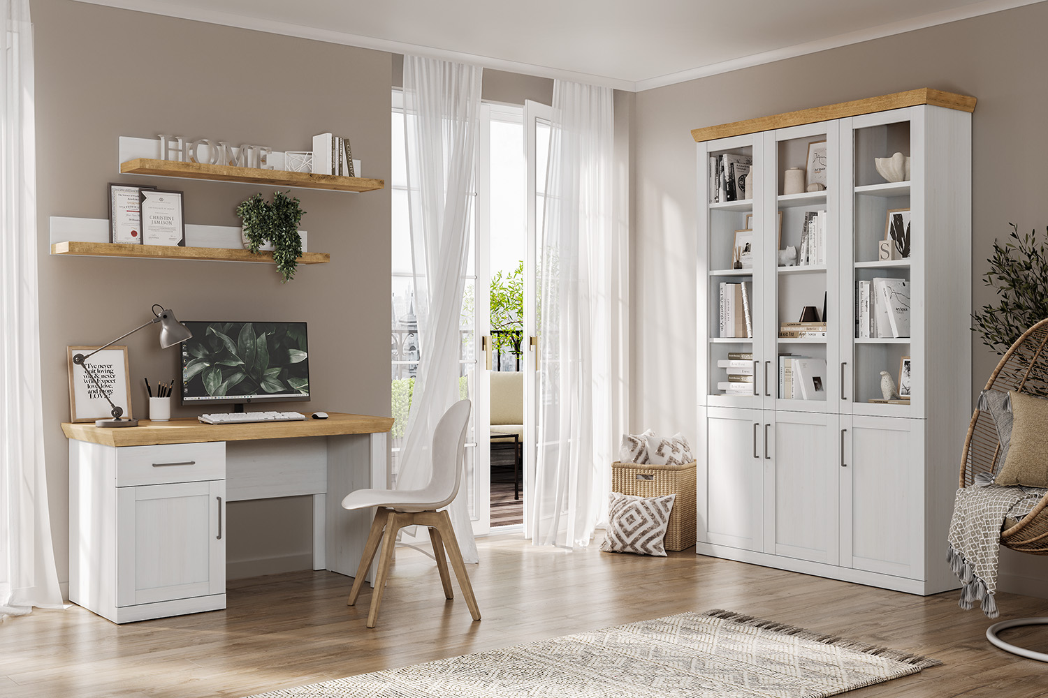 - Мебель выполнена в цвете «блан шене», верхние крышки шкафов и стола — в цвете «дуб бунратти»;