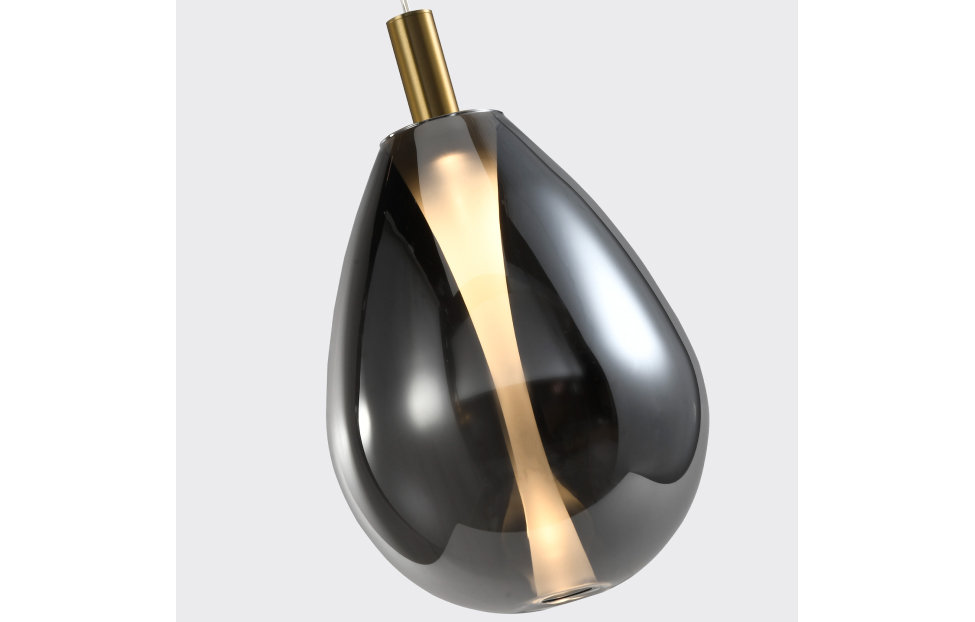 Особенностью подвесов Hopper является декоративный элемент в центре, формируемый в процессе выдувки стекла, который создает сложную и интересную форму плафона, становится основой его неповторимого облика. Плафон подсвечивается изнутри светодиодным источником света, создавая эмоциональное волнующее освещение. Подвес с каркасом в цвете латунь, с дымчато-серым плафоном, регулируемая высота.