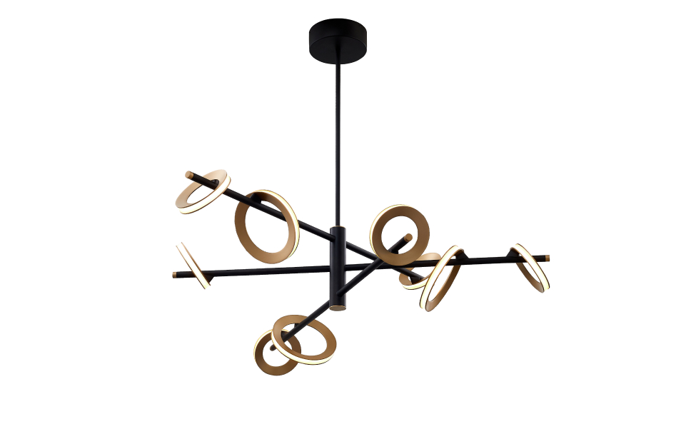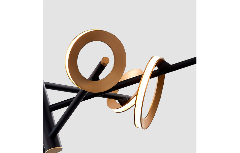 Коллекция Jongleur демонстрирует искусство баланса и динамики, где каждый элемент словно находится в постоянном движении. В качестве плафонов использованы объемные кольца цвета матовой латуни, которые светятся по периметру с помощью встроенной LED-ленты. Они закреплены под разным углом к тонкому черному каркасу светильника, будто вращаются вокруг основания, словно цирковые обручи хула-хуп. Регулируемая высота.