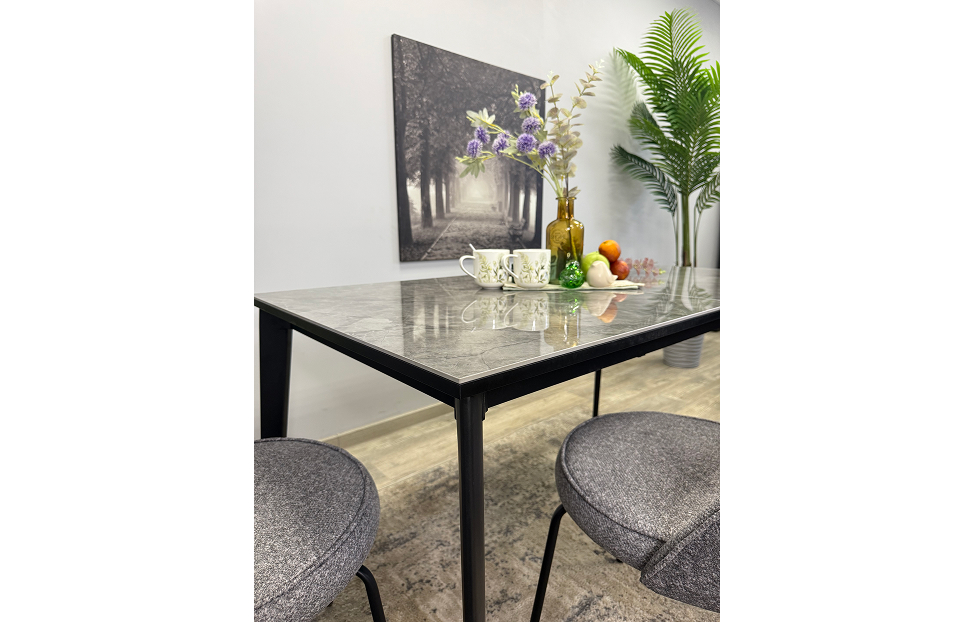 Керамика - наилучший и самый дорогой материал для обеденного стола. Она не портится от влаги, выдерживает температуру до 1000°С. Плотность керамики выше плотности металла и на ней не останутся следы от столовых приборов. Кроме того, это 100% натуральный материал в отличие от разного вида пластиков, также керамика обладает гипоаллергенными свойствами, и можно спокойно хранить продукты на столешнице.