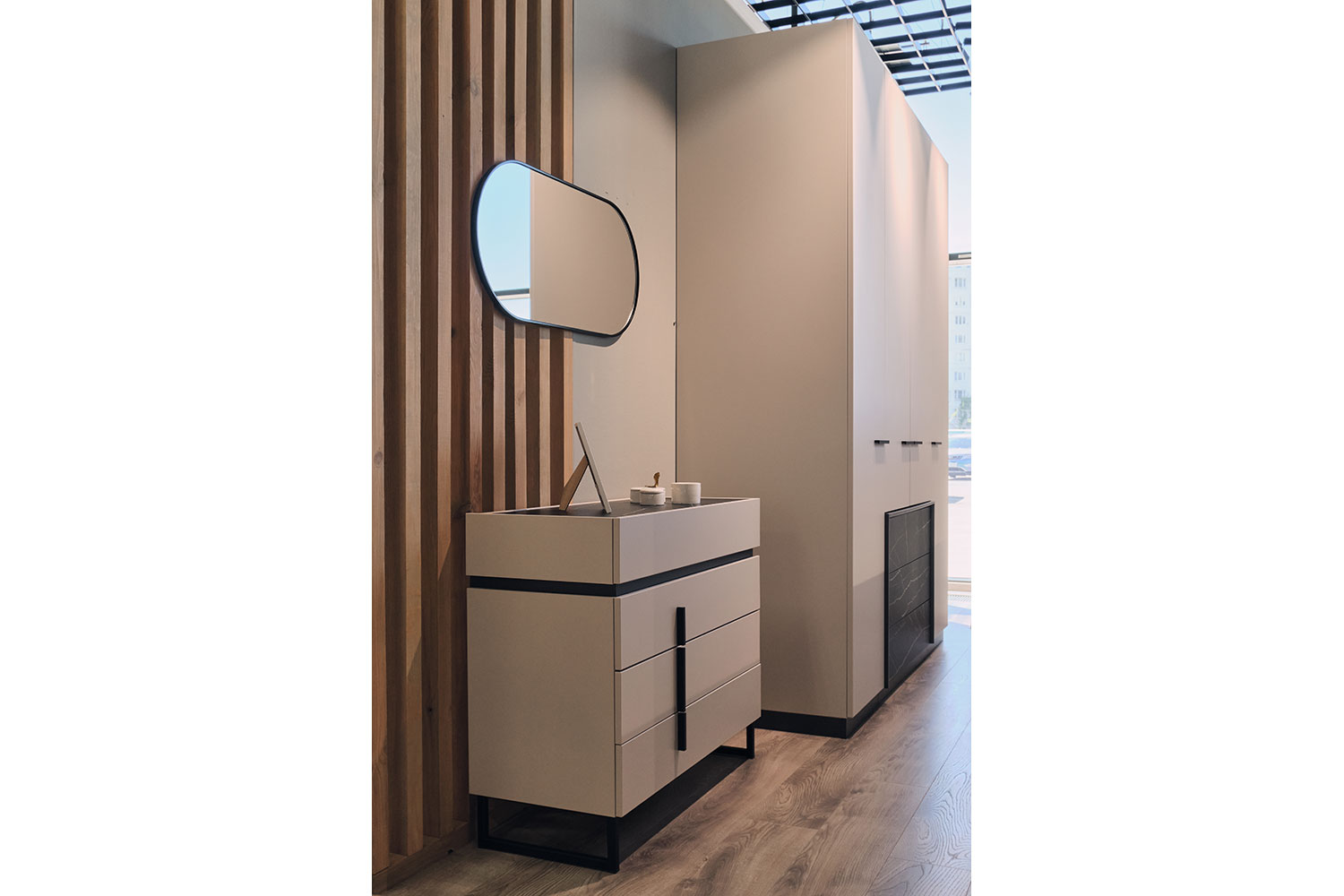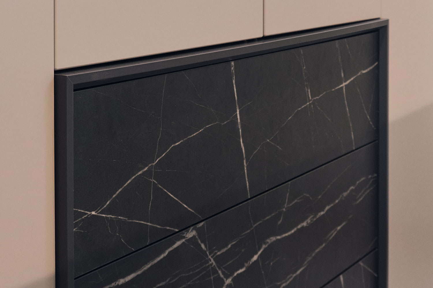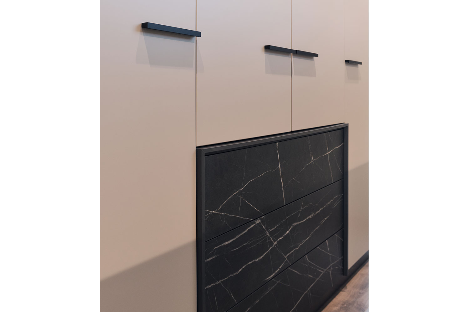 Все модули гармонично сочетаются друг с другом. Черный акцентный мрамор добавляет коллекции изысканности и роскоши, а выразительная геометрия тонких черных ручек на фасадах, перетекающая в линию опор, придают ей современный вид.